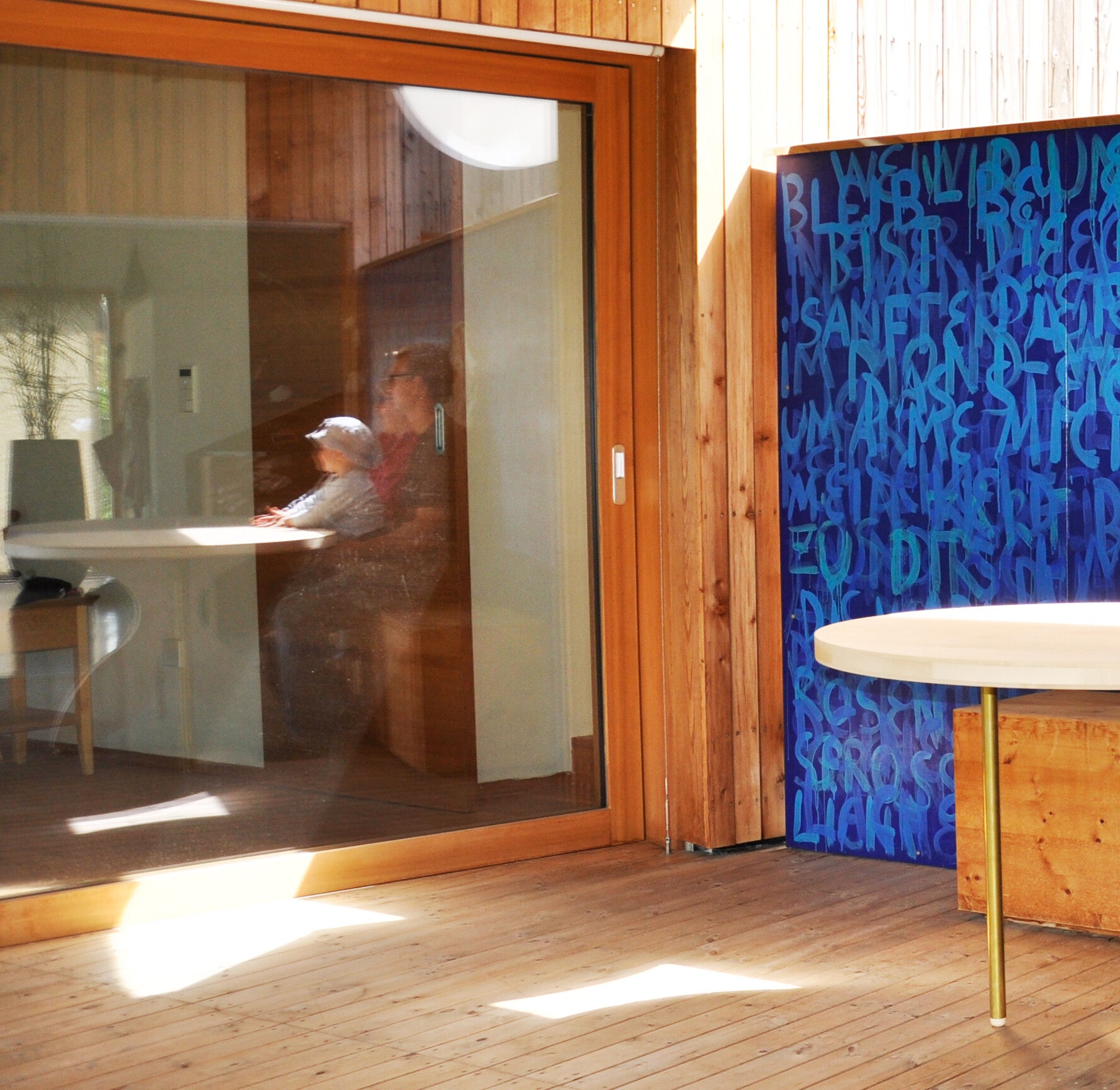 Eine bemalte Trennwand rückseitig mit eine großen, glänzendes Auge aus Edelstahl. Ein Tisch aus Ahorn und Nussbaumholz. Ein Gemälde fürs Wohnzimmer. Farbkonzepte und Sonnenblenden mit Garten Eden - Motiven.